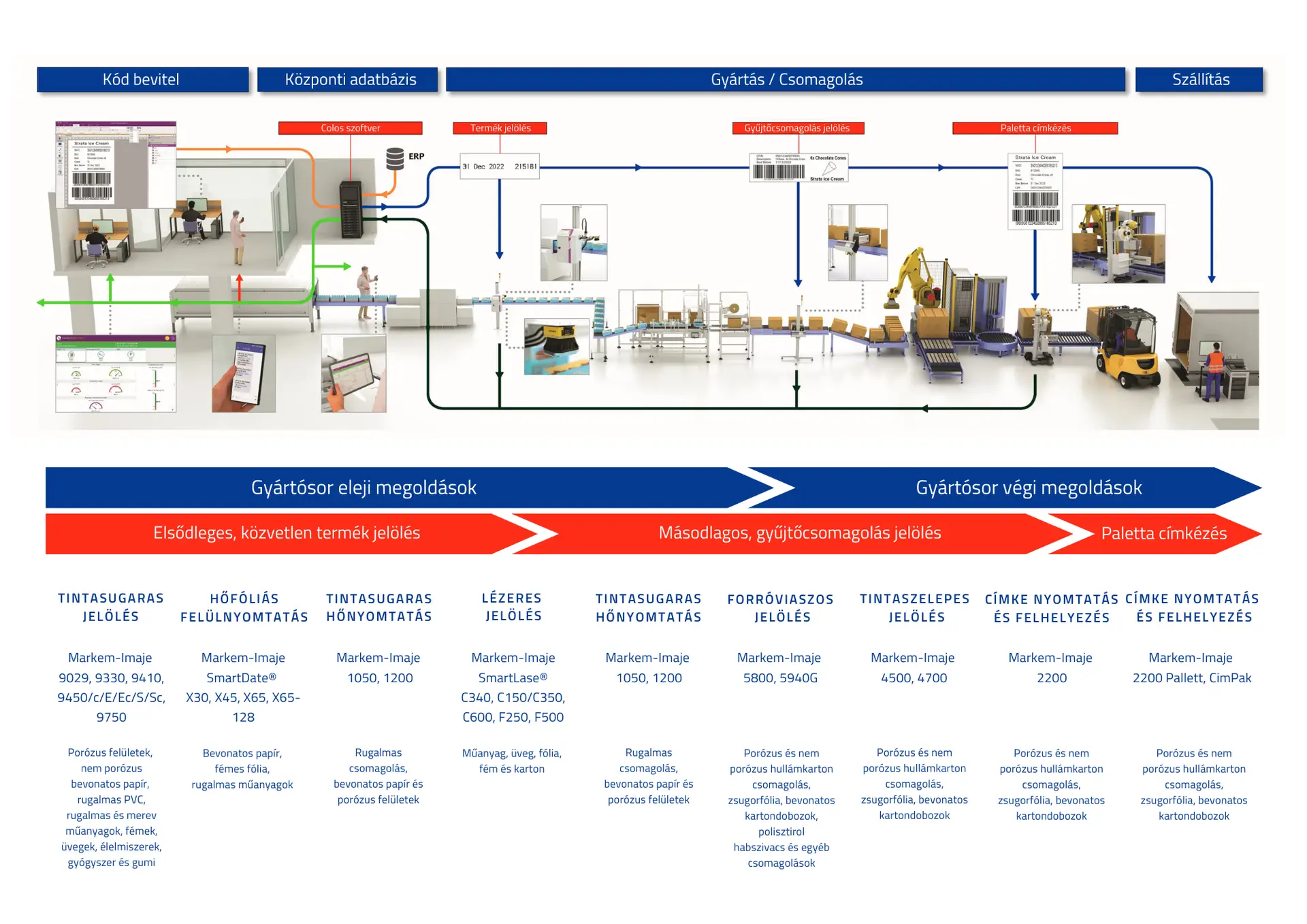 - Gyűjtőcsomagolás: címkézőgép, nagykarakteres direktfeliratozó